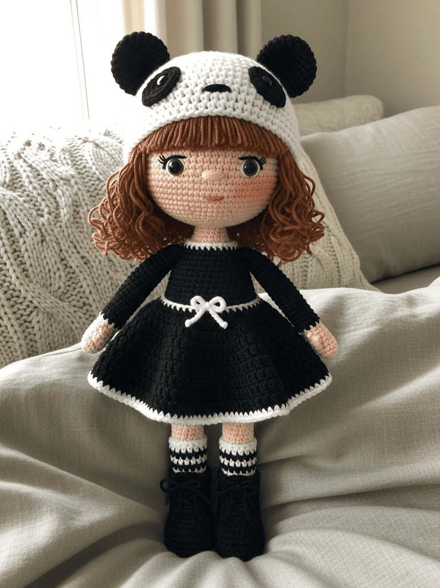 Pippa represents the “Embrace of Softness” aesthetic perfectly. The commercial appeal here lies in the seasonal specificity paired with high-detail accessories. While many patterns offer simple dolls, Pippa’s value comes from the textures—the ribbed “pumpkin” effect of her skirt, the realistic laces on her boots, and the intricate hair styling.