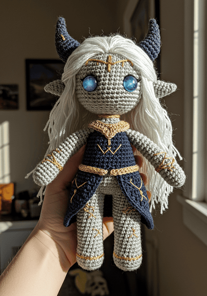 - Celestial Markings: Using your Metallic Gold thread and a yarn needle, begin the surface crochet and embroidery. This is your moment to be a true alchemist. Recreate the patterns from the vision on her forehead, chest, limbs, and horns. There is no right or wrong way; let your muse guide your hand.