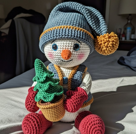 - Accessories: Place the vest on the body. Sew the pompom to the tip of the hat. Place the hat on the head (secure with a few stitches if this is for a child). Sew the tree to the inside of one mitten or arm.