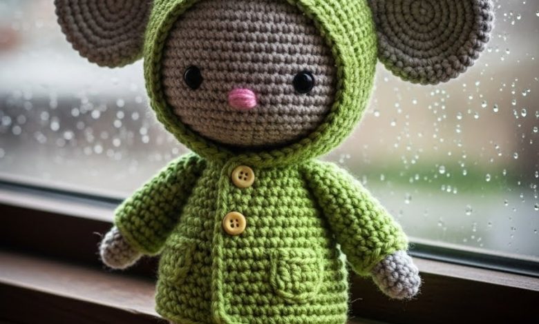 Barnaby is a dreamer, but he hates getting his grey fur wet. This outfit was designed to keep him dry while maximizing his charm. The “Froggy” poncho is oversized, giving him a bell-like silhouette that emphasizes his small stature. The hood features two bulging frog eyes that sit right on top of his own giant mouse ears, creating a stack of cuteness that is irresistible. The yellow boots are chunky and rounded, grounding the design with a pop of classic color.