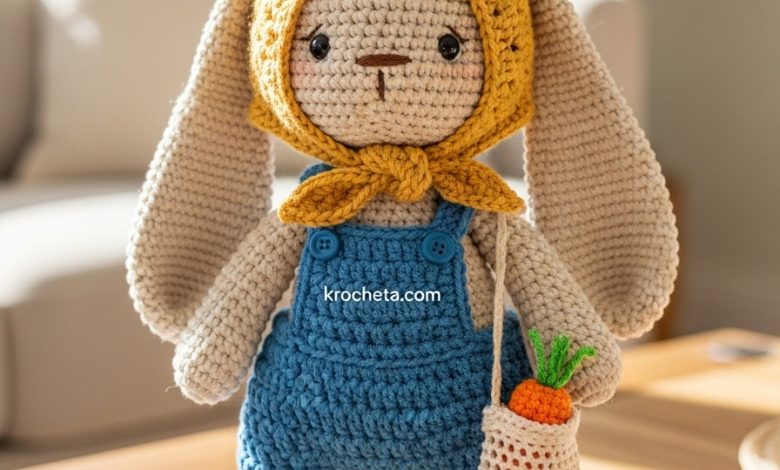 🧶 Yarn: Beige (Body), Faded Denim Blue (Dress), Mustard Yellow or Sage Green (Kerchief), Cream (Market Bag), Orange/Green (Carrot). 🪡 Hook: 2.5mm or 3.0mm ✨ Accessories: Safety eyes (10mm), 2 small wooden buttons (8-10mm), Stuffing.