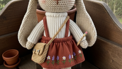 The Pattern: Clementine’s Base (Construct the standard Clementine head, body, ears, and legs using Beige yarn. Stuff firmly. Ensure she can stand by leaning back against a support.)