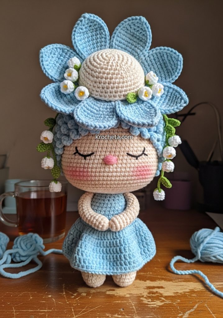 This Bluebell Maiden captures the very essence of a quiet spring morning. Her oversized, soft blue petals frame a face full of gentle innocence. Notice the placement of her eyes. They sit low on her face, beautifully wide-set to emphasize her youth and pure joy. We designed her without a single harsh angle, ensuring every curve from her plump cheeks to her tiny clasped hands invites a comforting squeeze. Choosing the right cotton yarn will make these pastel tones pop, giving her dress a satisfying drape and her floral crown the structural integrity it deserves.