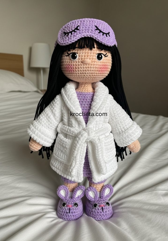 🧶 Yarn: DK weight cotton in light peach, soft purple, and black. Super bulky fluffy or chenille yarn in white for the robe.