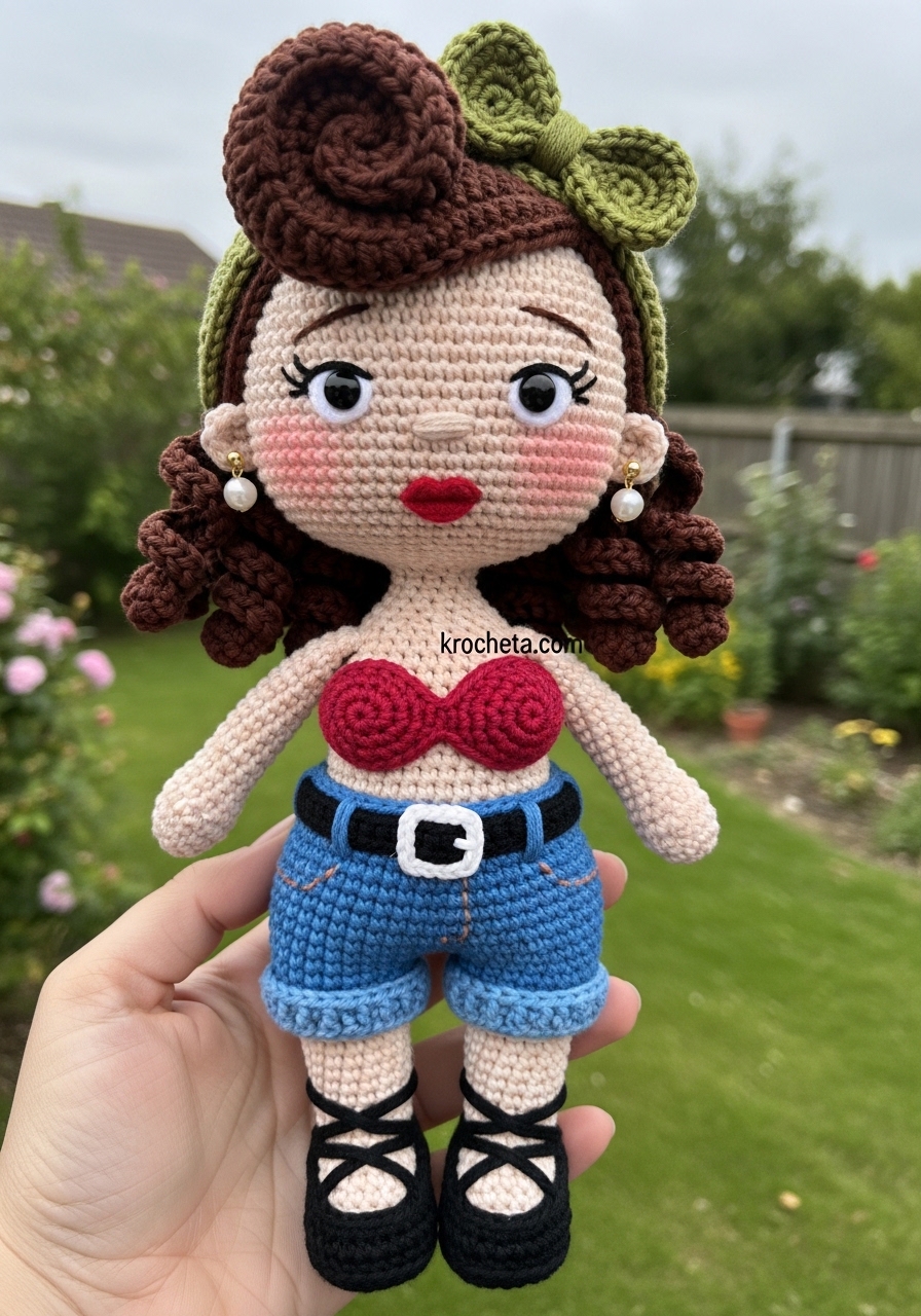 Hair Bow (Pink): Chain 6. Single crochet in the 2nd chain from the hook and across (5 sts). Single crochet evenly around the entire rectangle. Pinch the center tightly and wrap with yarn 5 times. Secure and sew to the head.