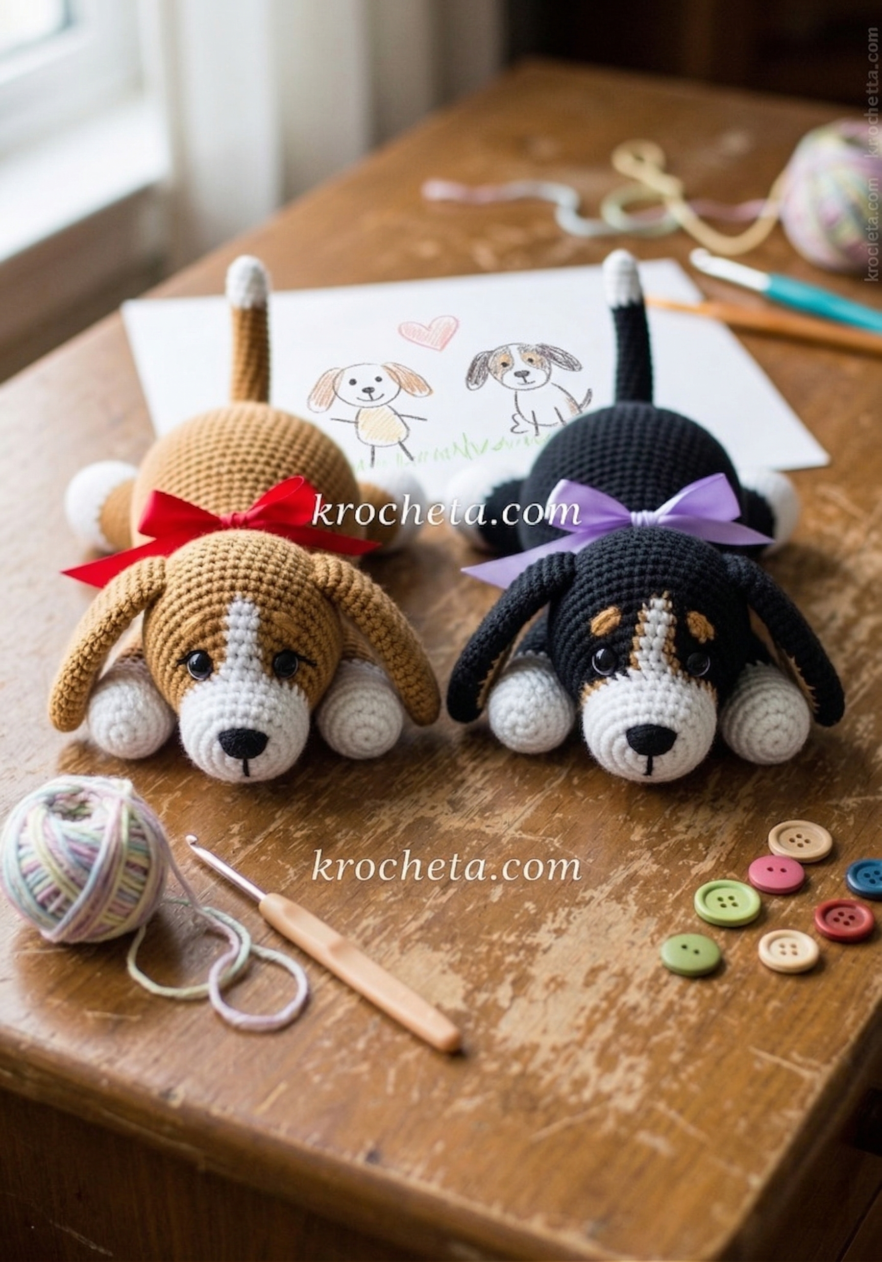 Other Materials: 10 mm safety eyes, fiberfill stuffing, stitch markers, yarn needle, a length of fabric ribbon.