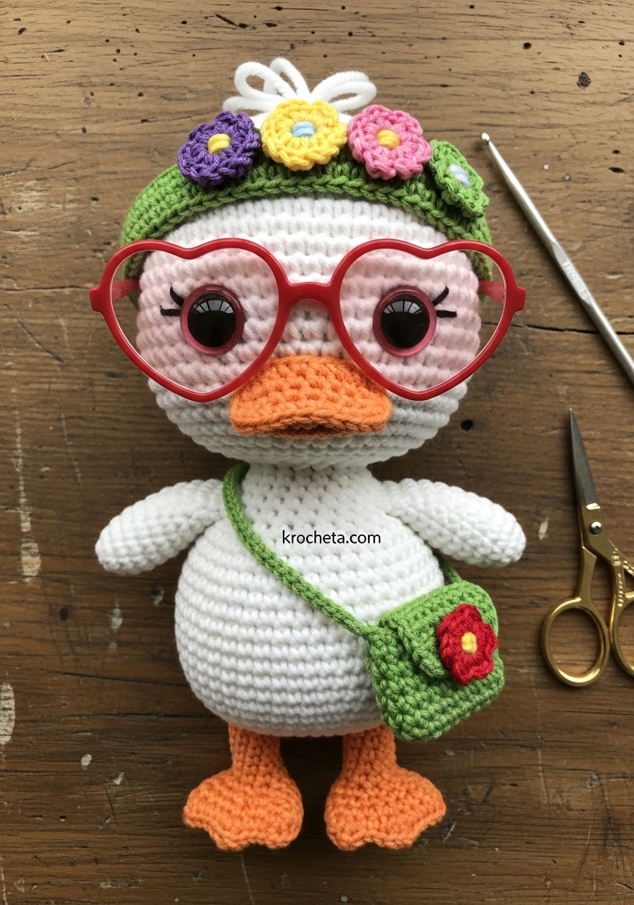 ➡️ Dress Flora by placing the headband over her head, resting the glasses on her beak, and draping the satchel across her shoulder.